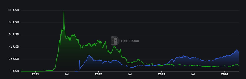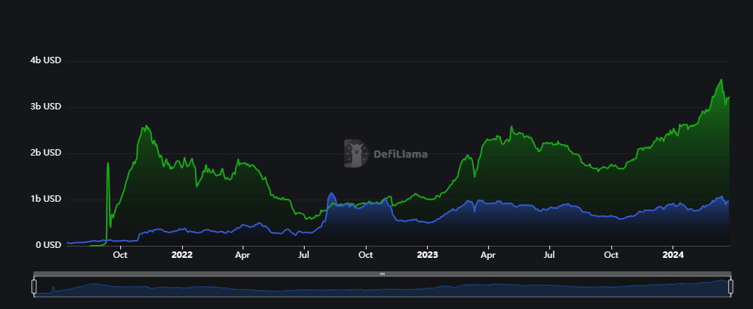 fecha (fines de marzo del 2024) en 3.24 billones para Arbitrum y 963 millones