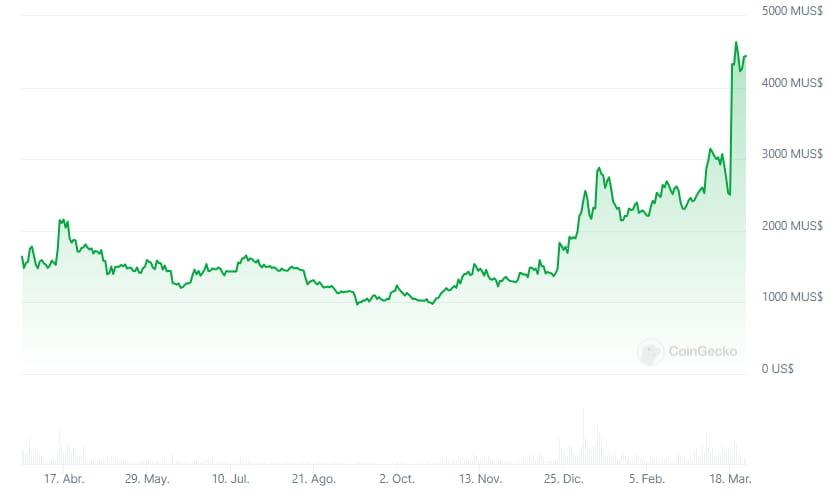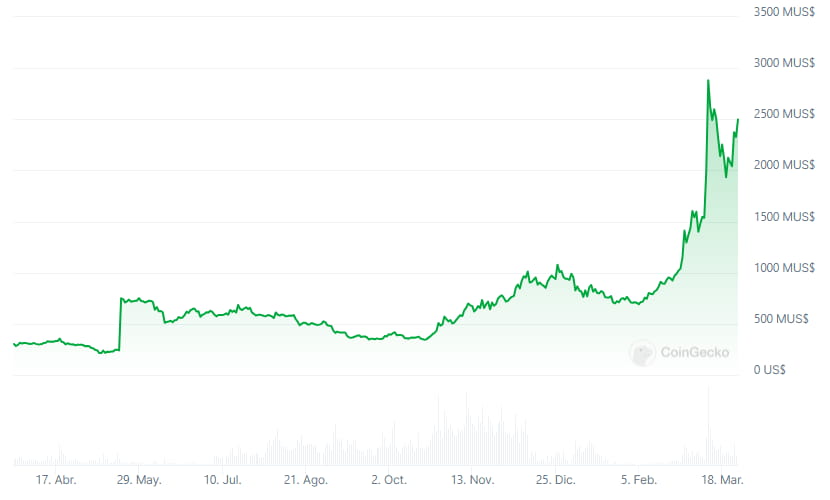 ver el gráfico histórico aquí, con los valores de Arbitrum en verde: