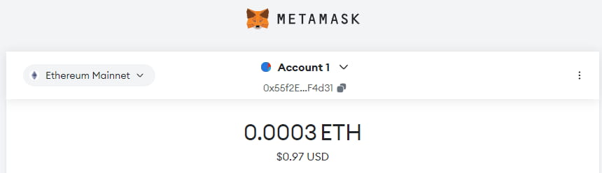 MetaMask), verás que tu red es la mainnet de Ethereum y tu cantidad de dinero.