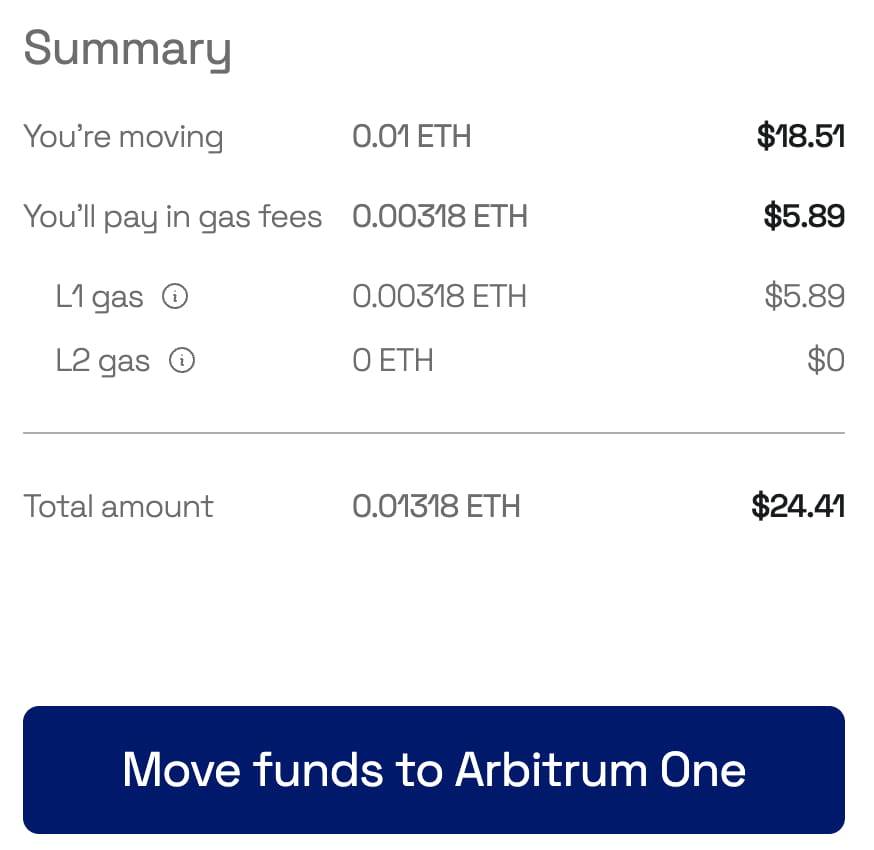 11. Una vez que hay elegido el monto a mover desde la mainnet de Ethereum hacia Arbitrum One o Arbitrum nova, se te ofrecerá más abajo, y en la misma pantalla, un resumen de lo que vas a hacer: cuánto dinero mueves, cuánto es la comisión de gas, y el total de la operación: