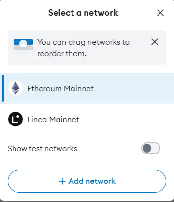 1. Antes que nada, vamos a agregar la red de Arbitrum a nuestra billetera. Esto es muy sencillo. ¿Ves allí donde dice "Ethereum Mainnet". Pues bien, es en esa sección en donde puedes elegir a qué red contectarte.