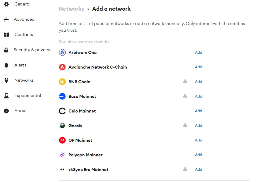 3. En la nueva sección deberás elegir entre todas las opciones que tienes. Elegirás Arbitrum, pues es a esa red hacia donde vas a enviar tus cryptomonedas desde la mainnet de Ethereum. Presionarás en Add para agregarla: