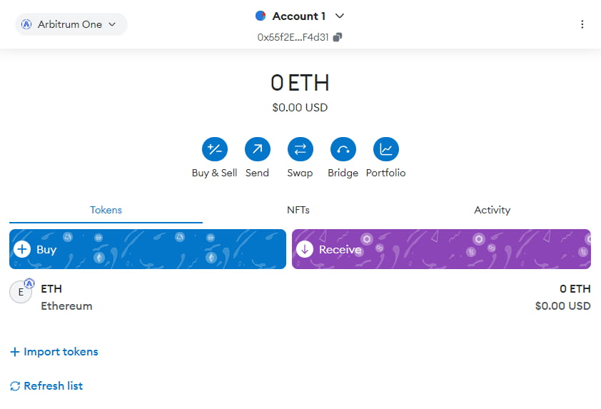 6. Y eso es todo. Ahora estás visualizando tu red de Arbitrum vinculada a tu wallet. Desde la misma sección de arriba a la izquierda puedes volver a seleccionar la mainnet de Ethereum, volver a la de Arbitrum, etcétera.