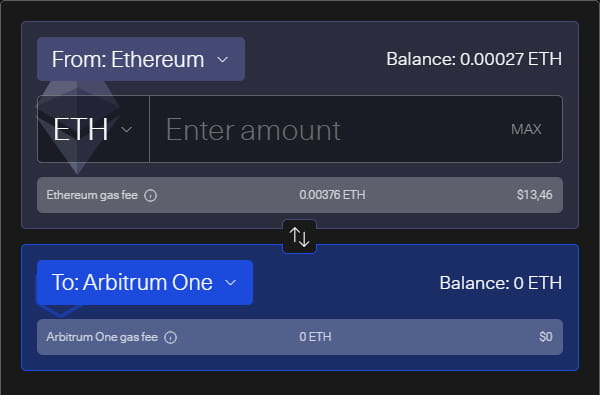 9. Una vez completado este paso, podrás elegir desde qué red y hacia cuál red mover tus crypto. Verás, en la sección superior, el sitio desde el cual vas a mover el dinero —en este caso, la mainnet de Ethereum—, el balance —o sea, la cantidad de crypto que tienes en la mainnet— y, por último, un casillero en donde puedes colocar la cantidad de dinero que deseas enviar. A su vez, en la seccion inferior, verás la red de destino (que será Arbitrum) y el balance de dicha red; es decir, cuánto dinero tienes en la red de Arbitrum. Si es la primera vez que haces esto, será 0. Si ya has utilizado el servicio y tienes crypto en la red de Arbitrum, figurará cuánto tienes allí: