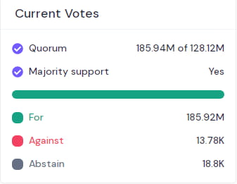 En cuanto a votaciones activas relevantes, nos limitamos a señalarte una que tendrías que tener en cuenta: aquella que propone algo que, aunque obvio, debe ser decidido democráticamente por la dado; es decir, la modificación y actualización técnica de Arbitrum para colocarse a la par y homologarse de la manera más funcional y segura posible al inminente fork de Ethereum del cual te vamos a hablar más abajo en este mismo boletín. Como puedes sospechar, la misma será aceptara con un virtual 100% de aprobación: