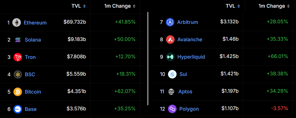 Por su lado, las comparaciones en término de TVL (valor total bloqueado) también marcan una clara tendencia en favor de Ethereum, que destaca con casi 70 mil millones, representando Arbitrum 3 mil millones; por su lado, Solana totaliza apenas nueve mil millones: tres veces más que Arbitrum para toda la cadena: